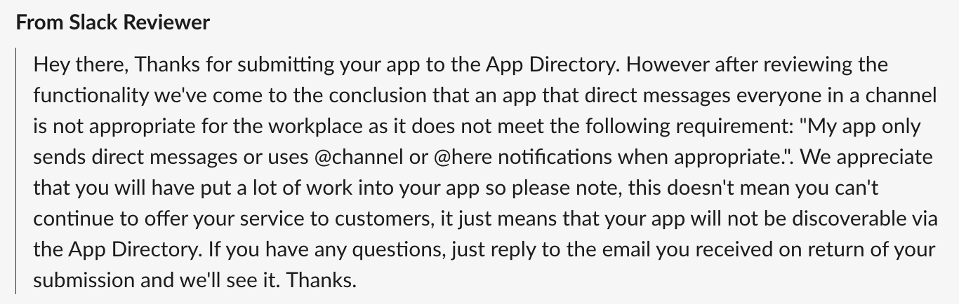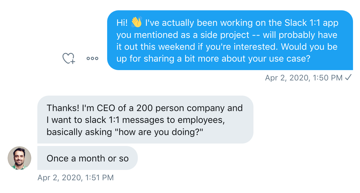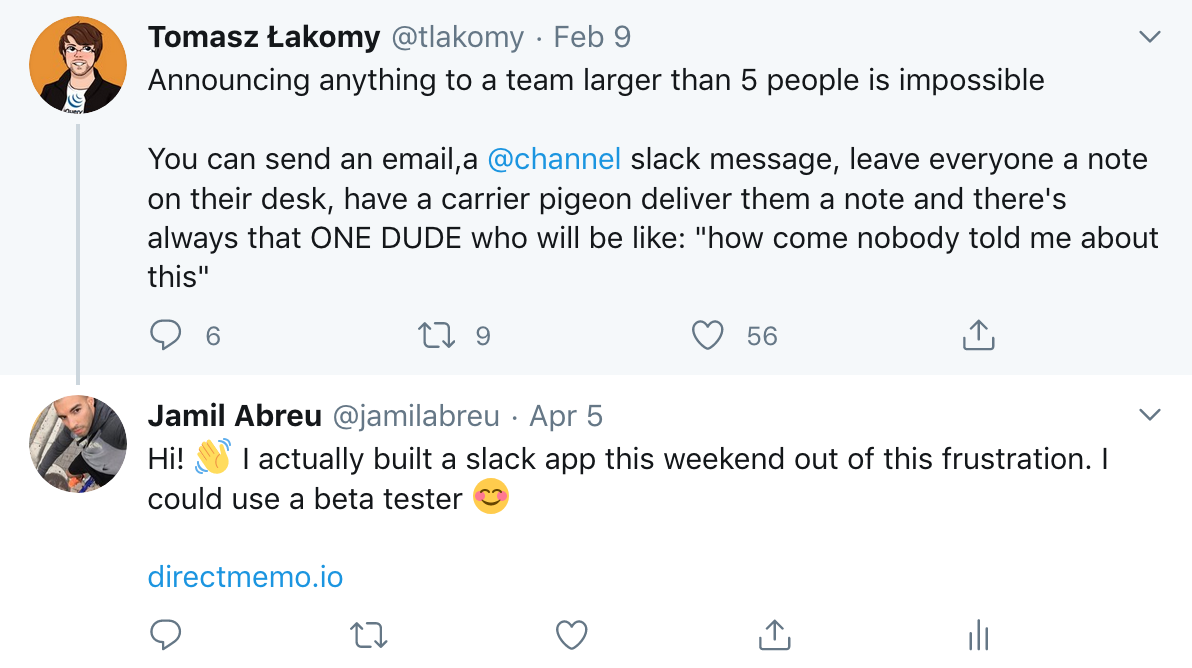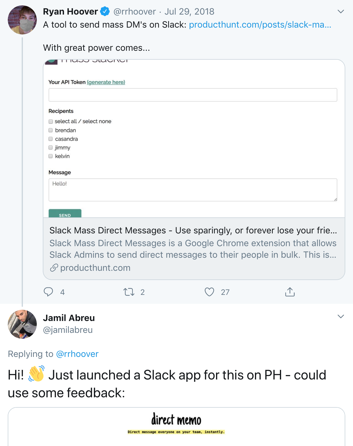My next move was to scour Twitter for phrases related to “Slack team tasks”, “Slack mass-messaging”, etc. and reach out directly to as many people as possible.